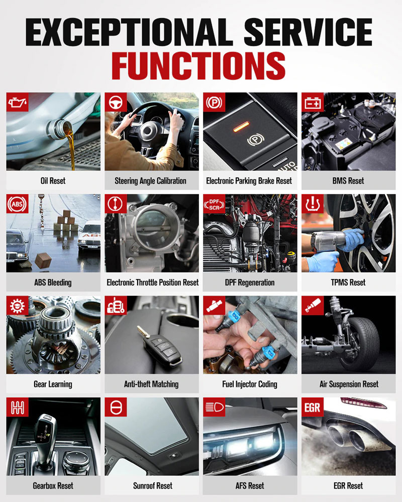 Accompany with continuous update of Launch X431 software and program, More functions has been added : Head light Fitting, Seat Matching, Door and Window Initialization Study, Sunroof Initialization, Air Suspension Matching, Gearbox Matching, Injector Calibration, Multimedia Video Reset, Cluster Reset, Immobilizer Service, Tire Change Reset, (depending on the specific car models, not for all cars, ). and more and more function will be improved and optimized ....