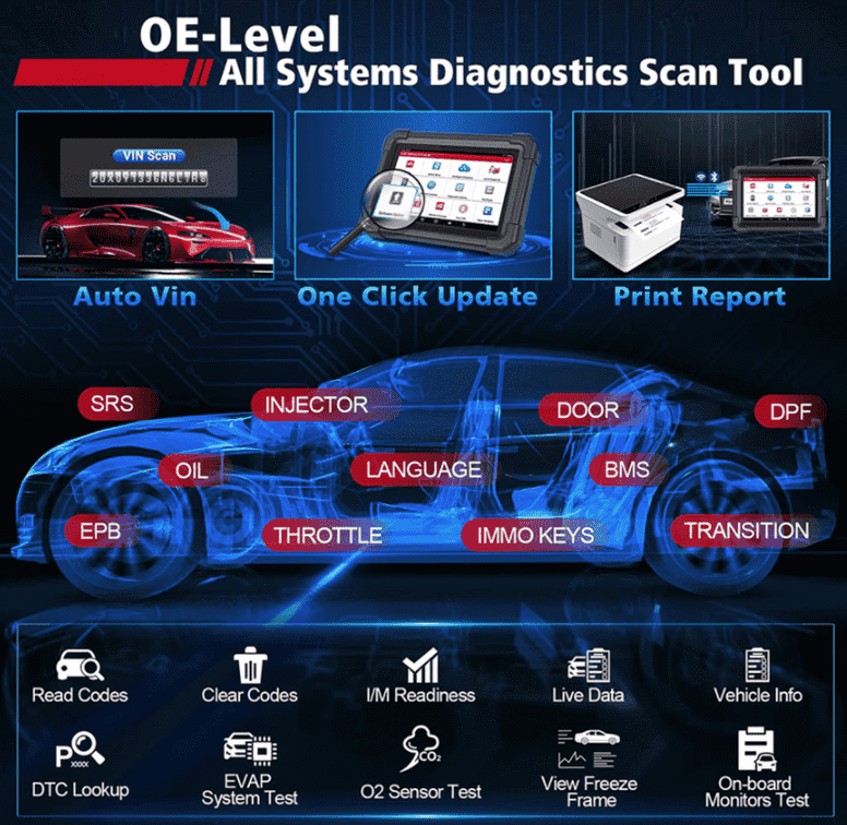 1. For Engine System:help detect the engine ignition, fuel injection, air and fuel ratio, and exhaust emission conditions in Engine system to enhance vehicle performance, save energy and reduce exhaust emission.