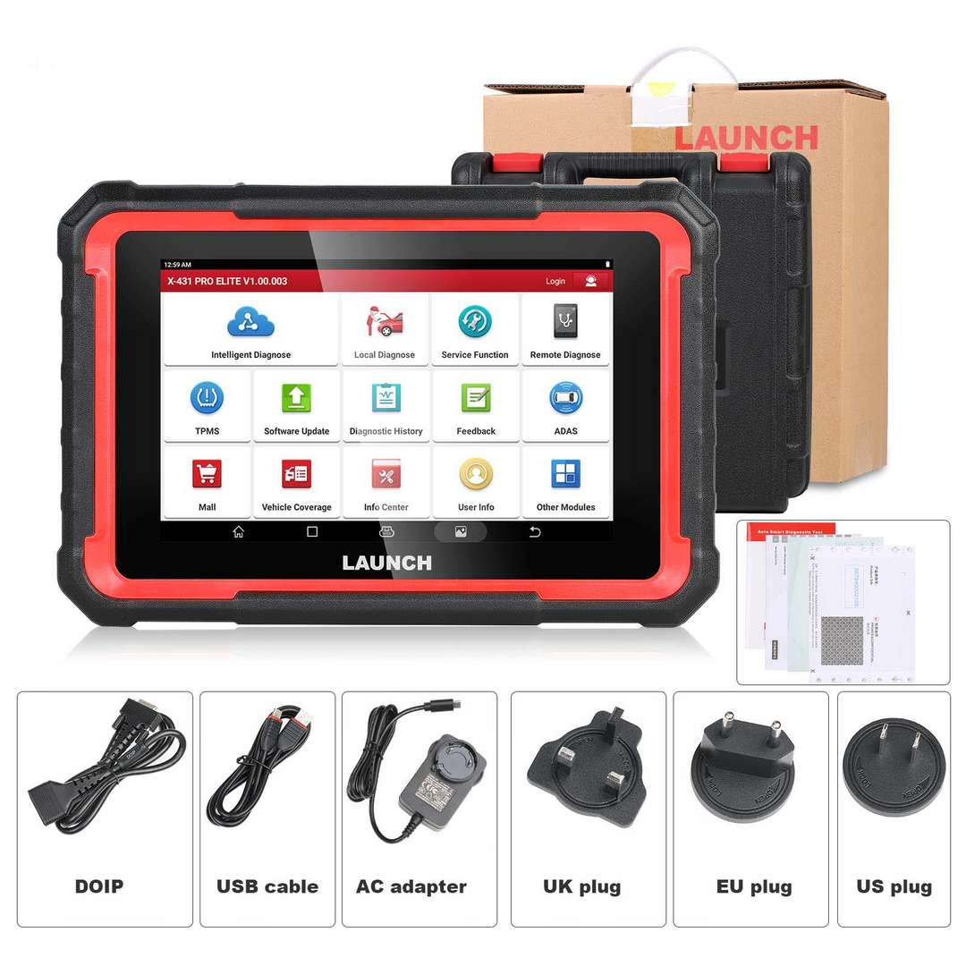LAUNCH X431 PRO ELITE is 2023 new released all-in-one automotive car diagnostic scan tool, comes with Full Bi-directional Control, 32+ Maintenance Services, OE All Systems Diagnostics, FCA AutoAuth, CANFD DOIP, VAG Guided, Refresh Hidden Functions, Fast Auto Vin, Remote Control, 10,0000+ Vehicle Coverage, 25 languages and Optional Functions: High-end Complete TPMS Functions(Need to work with x431 tsgun); Advanced Key Programming (Need to work with x-prog 3) and more extension modules. At a lower cost, Launch obd2 scanner X431 PRO ELITE combines all the hot functions of comprehensive scanners according to the customer's favorite need.